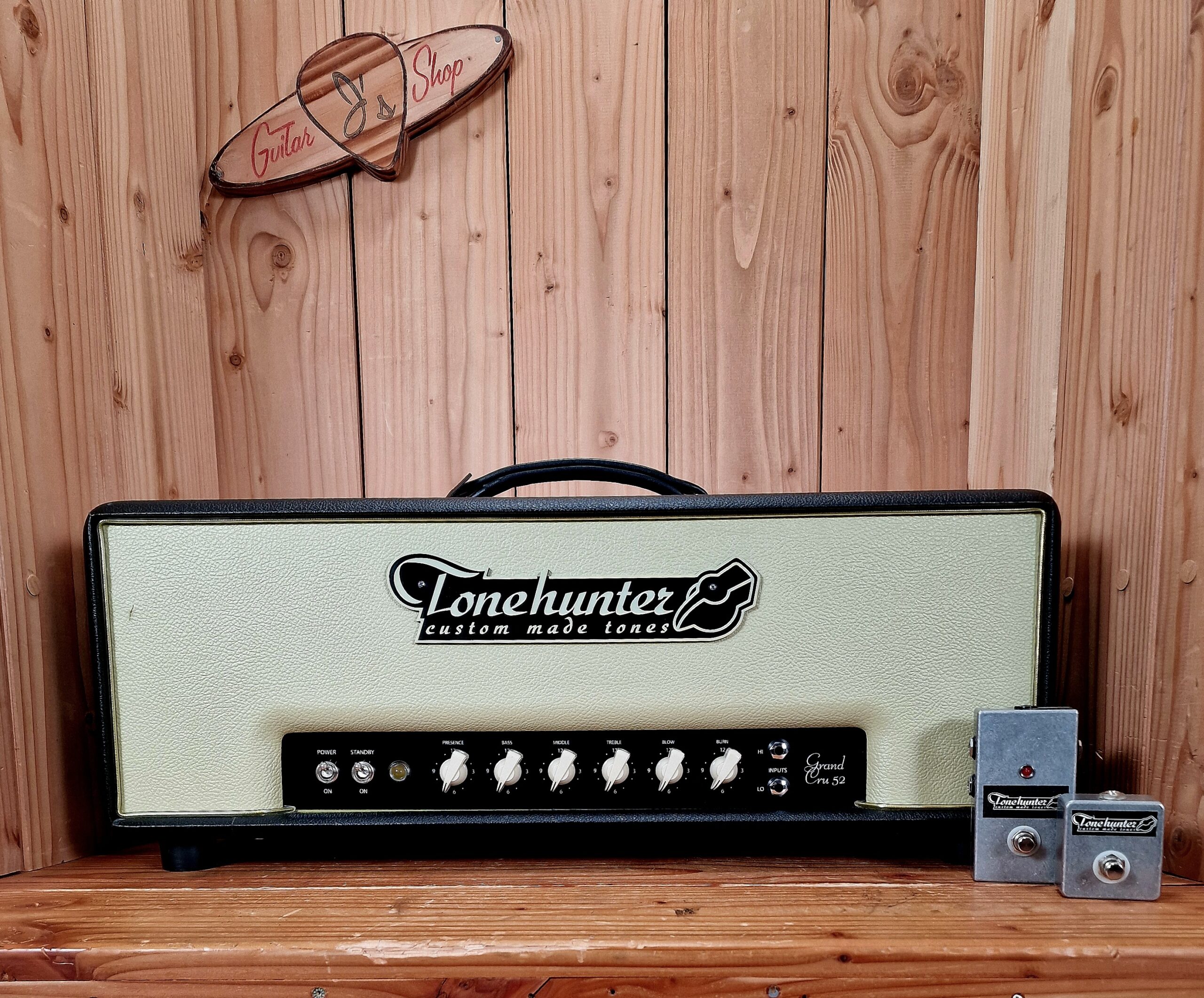 Bis vor recht kurzer Zeit hat die Firma Tonehunter (Ralf Reichen) mit dem Grand Cru 52 eine eigene, sehr dynamische, heissere variante des Britischen klassikers produziert. Der Grand Cru wartet mit allerlei sinnvollen und praxistauglichen features auf. Mit einem Röhrengebufferten FX Loop, der zusätzlich im Pegel regelbar ist, und für den Puristen aber auch mittels switch aus dem Signalweg genommen werden kann. Bei der im Lieferumfang enthaltenen Tonehunter AB Box können die beiden Inputs belegt werden, und somit hat man einen zweikanaligen Amp. Des weiteren kann mit dem ebenfalls mitgelieferten FS eine weitere Gainstufe die etwas lauter ist (Solo Volume z.B.) geschaltet werden.